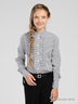 Приталенная модель с отложным воротом застегивается на пуговицы по всей длине изделия. Манжеты на пуговицах. Фигурные вытачки. Планка застежки украшена рюшами.