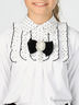 Трикотажная блуза из приятного на ощупь материала. Хлопковый отложной воротник на стойке в черный горох. Планка-застежка на пуговицах. Полочка декорирована оборками и крупной брошью - бантов. Теплая и комфортная модель прекрасно подойдет под пиджак, но сохранит удобство и свободу движений.