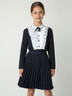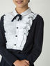 Синяя блузка с длинным рукавом выглядит потрясающе! Изюминка модели - отделка белым текстилем в складку, имитирующим жабо. Белый воротник и контрастный отстегивающийся бант придают модели строгость и элегантность. Великолепное качество трикотажного полотна создает приятные тактильные ощущения и гарантирует свободу движений. С любыми брюками, юбкой, трикотажная блузка составит стильный элегантный комплект, подчеркивающий красоту и индивидуальность девочки.