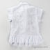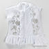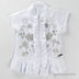 Блуза прямого кроя с короткими рукавами. Воротник-стойка. Закрывается на молнию. По низу изделия и вдоль молнии пришиты оборки. Блуза украшена декоративной прострочкой и бисером.