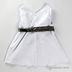 Блуза без рукавов на пуговицах сзади. На отрезном лифе платья находится драпировка и декоративная складка, создающие эффект банта. На боковых швах пришиты петли для ремня, в которые вставлен атласный пояс.