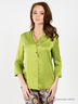 Детали: V-образный вырез горловины, застежка на пуговицы, укороченные рукава с небольшими отворотами. Вырез горловины декорирован бантовыми складками.
