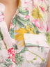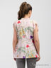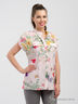 Блуза прямого силуэта, рукав спущенный короткий. Воротник стойка, на полочке планка и застежка на пуговицы. На полочке притачные карманы с клапанами. По низу боковых швов разрезы. Принт розовый цветочный