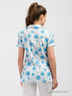 Блуза с отложным воротником, застежка на пуговицы до низу, планка на полочке. Рукав втачной, небольшой фонарик, по низу рукава притачная манжета. Принт голубые цветы на белом фоне.