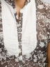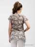 Блуза полуприлегающего силуэта со стойкой, планкой на полочке и застежкой до низу. На полочке кокетка фигурной формы белого цвета. Рукав спущенный короткий.