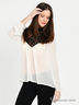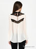 Эффектная, стильная блуза прямого покроя из приятного на ощупь материала. Округлый вырез горловины. Воротник-стойка. Застежка на спинке на пуговицы. Длинные свободные рукава собраны на резинку на манжете. Кружевные вставки на спинке и полочке.