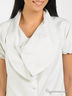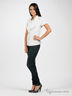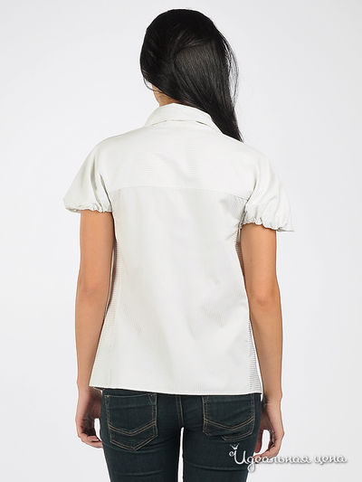 Блуза оригинального кроя с коротким рукавом. Отложной фигурный воротник, несущий декоративную функцию. Планка-застежка с пуговицами. Приталенный силуэт. Рукав-баллон.