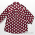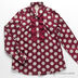 Детали: отложной ворот-стойка, застежка на перламутровые пуговицы до середины изделия, манжеты на пуговицах, планка-застежка украшена оборкой, встречные складки на спинке
