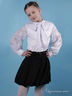Белая блузка с длинным рукавом. Спереди модель украшена красивым белым бантом. Рукав с расширением к манжету. Воротник-стойка. Спереди на полочке застрочены складки. Форма и размер цветов на ткани рукава могут немного отличаться от фото.