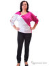 Блуза прилегающего силуэта из трикотажного полотна двух цветов. Рукава длинные, цельнокроеные с передом и спинкой, двухшовные с декоративным вырезом, настроченным на плоскошовной машине и скрепленные бусинами. Спинка блузы со средним швом состоит из четырех частей. Перед состоит из двух частей. В шов переда закреплена декоративная шлевка. Горловина круглая.