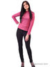 Блузка — водолазка прямого силуэта, с рукавами реглан, с воротником стойка. Низ изделия и рукава подшиты на машине плоского шва.