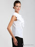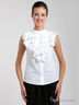 Потрясающая блуза без рукава с небольшим воротом. Застегивается на пуговицы. Полочка декорирована жабо. Для настоящей леди.