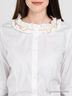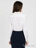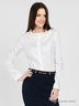 Эффектная блуза с округлым вырезом горловины, оригинальным воротом-рюшей, украшенным пришитой цепочкой с бусинами и длинным рукавом. Манжеты на пуговице, застежка на пуговицы. Рельефные вытачки. Для настоящей леди.