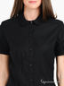 Стильная блуза с короткими рукавами и отложным воротником стойкой. Приталенный силуэт. Выполнена из гладкой хлопчатобумажной ткани. Застежка на пуговицы. Рукава с манжетами, украшены декоративными бантиками. Прекрасный вариант для юбки и брюк!