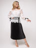 Романтичная женская блуза Белив выполнена из легкого, невесомого материала. Оформлена гипюром в тон изделия в области декольте и на рукавах. Украшают блузу бархатные ленты- завязки (на талии и на рукавах). В комплект входит чокер из гипюра на бархатной ленте. Застегивается по спинке на декоративную пуговку.