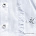 Приталенная модель с воротником-стойкой застегивается на пуговицы на полочке по всей длине изделия. Манжеты на пуговицах. Полочка, манжету и ворот декорированы оборками. Полочка украшена логотипом из страз.
