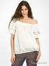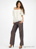 Элегантная блуза свободного силуэта. Широкий вырез-лодочка с декоративными сборками на прострочке. Также сборками декорирорированы манжеты. По нижней части изхделия проходит кулиска со урком, позволяющим регулировать длину и ширину изделия.