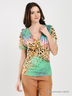 Эффектная блуза из тонкого, мягкого трикотажа. V-образный вырез горловины. Короткие рукава. Полочка и спинка дополнены укороченной отлетной подкладкой. На полочке декоративный пришивной элемент.