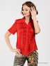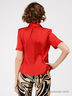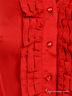 Детали: стоячий-отложной воротник, застежка на планку с пуговицами, короткие рукава с оборкой, полочка декорирована вертикальными рядами оборок, поролоновые наплечники.