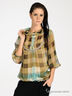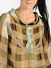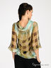 Блузка из тонкой прозрачной ткани прямого кроя. Ворот-хомут. Кокетка украшена рюшей. Длинные рукава и низ изделия присборены резинкой.