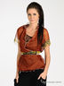 Блуза из тонкой струящейся ткани вырез с запахом и низ изделия декорированы рюшей и утянуты резинкой. Рукав-реглан. Втачной пояс дополнен лентой из той же ткани, что и вся блузка.