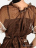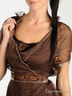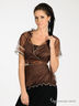 Блуза из тонкой струящейся ткани вырез с запахом и низ изделия декорированы рюшей и утянуты резинкой. Рукав-реглан. Втачной пояс дополнен лентой из той же ткани, что и вся блузка. Внутри блузки топ из атласной ткани с регулирующимися бретельками.