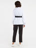 Легкая блуза свободного кроя выполнена из льняного полотна. Модель рубашечного кроя, вырез горловины оформлен отложным воротником на стойке. Длинные втачные рукава обработаны манжетами.