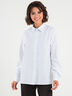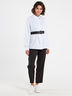 Легкая блуза свободного кроя выполнена из льняного полотна. Модель рубашечного кроя, вырез горловины оформлен отложным воротником на стойке. Длинные втачные рукава обработаны манжетами.