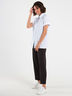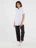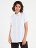 Легкая блуза свободного кроя выполнена из льняного полотна. Модель рубашечного кроя, вырез горловины оформлен отложным воротником на стойке. Короткие втачные рукава обработаны манжетами.