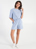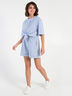 Легкая блуза свободного кроя выполнена из плательно-костюмного полотна в полоску. Модель рубашечного кроя, округлая горловина обработана внутренним кантом. Втачные рукава длиною до локтя обработаны манжетами. По спинке притачная кокета.