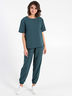 Легкая блузка выполнена из льняного полотна однотонной расцветки. Модель свободного кроя. Округлый вырез горловины обработан внутренней обтачкой. Короткие втачные рукава обработаны манжетами