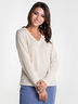 Кофта прямого кроя с V-образным вырезом, выполнена из трикотажного меланжевого полотна. Вырез горловины обработан обтачкой. Рукава длинные втачные.