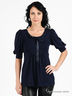 Детали: округлый вырез горловины декорирован продетой атласной лентой с бантиком, короткий рукав посажен на манжету, отрезной лиф, складки