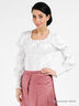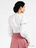 Элегантная блуза из тонкой, мягкой, приятной на ощупь хлопковой ткани с серебристым напылением. Широкий округлый вырез горловины. Прямые свободные рукава. Отрезной лиф. Застежка сбоку на молнию. Горловина, рукава, манжеты и часть спинки собраны на резинку. Горловина декорирована бантом из тонкой атласной ленты.