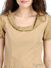 Детали: вырез горловины лодочка, воротник втачной стойкой, рукав фонарик, платье отрезное по линии талии, два накладных кармана декорированных бантами, разрез к низу юбки.