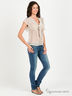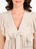 Детали: V-образный вырез с запахом; отрезной лиф присборен на резинку; короткие рукава в виде воланов; на лифе простроченные складки и оригинальные завязки