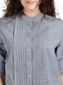 Детали: ворот стойка на круглом вырезе горловины, застежка на пуговицах, рукав завернутый на хлястике с пуговицей однокроеный, спинка присборена.