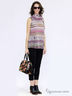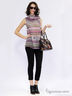 Блузка из шифона без рукавов, воротник стойка украшен романтичными рюшами в несколько рядом. Силуэт к низу расклешенный.