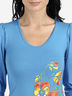Детали: круглый вырез, укороченные рукава с манжетами, полочка украшена набивным рисунком