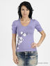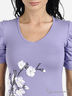 Детали: v-образный вырез, короткие рукава-фонарики, полочка украшена оригинальным набивным рисунком