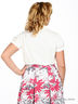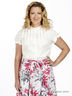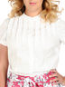 Детали: воротник-стойка, короткие рукава с присборенными манжетами на резинке, застегивается на пуговицы, полочка украшена рюшами