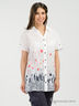 Стильная блуза свободного кроя с короткими рукавами и отложным воротником. Спереди застежка на пуговицах. Декорирована модель интересным принтом. Изделие будет прекрасно сочетаться со многими элементами гардероба.