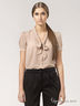 Блуза с короткими рукавами и воротником-стойкой. Изделие выполнено из качественного, полупрозрачного материала привлекательной расцветки. Спереди модель дополнена бантом. Отличный вариант на каждый день.