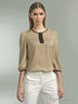 Стильная блуза с рукавами 3/4 и округлым вырезом горловины. Спереди присутствует декоративный элемент. Отличный вариант на каждый день.