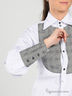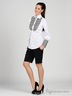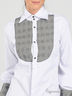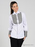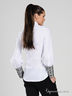 Слегка приталенная белая блузка из плотного, слегка эластичного материала. Отложной воротник на стойке. Застегивается на планку с пуговицами. Длинные рукава с манжетами на пуговицах. Манишка и манжеты выполнены из клетчатой полушерстяной ткани.