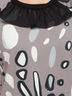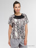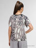 Удобная и модная блуза интересной расцветки. Модель с короткими рукавами и округлым вырезом горловины. Изделие декорировано на горловине контрастными маленькими рюшами.
