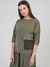 Блуза женская прямого силуэта, с цельнокроеным рукавом. Горловина круглая.Перед с наладным карманом с клапаном. Спинка и рукав с членением.Низ рукава с притачной манжетой. По верхнему шву рукава, по спинке вертикально и горизонтально втачены отделочные детали из шифона шириной 2,0см в готовом виде. Клапан и нижняя часть рукава выполнены из тонкой плащевой ткани , накладной карман из шифона в тон основного сырья.Цвет хаки.