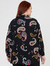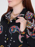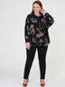 Блуза прямого силуэта, разноуровневая. Перед по центру с планкой, застегивающейся на петли и пуговицы, с накладным карманом . Плечо спущенное, рукав длинный, втачной, по низу на притачной манжете, застегивающейся на петлю и пуговицу. Спинка с кокеткой. Воротник с острыми концами на стойке, застегивающейся на петлю и пуговицу. Размеры блузы сдвоенные.