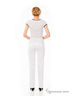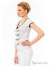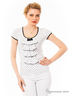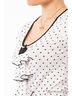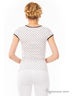 Прекрасная кофточка с округлым глубоким вырезом горловины и короткими рукавами. Модель украшена декоративными оборками и рисунком в мелкий горох. Идеальный выбор для современной девушки.