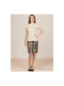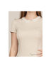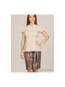 Блузка немного расклешенного к низу кроя с отделкой по горловине из искусственного жемчуга.